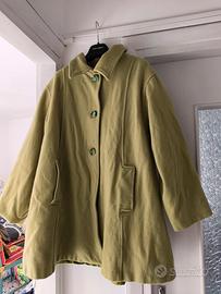 Vendo cappotto da donna, taglia Small, made in Italy, colore verde, in panno, larghezza spalle 45 cm, larghezza da ascella a ascella 58 cm circa, lunghezza da spalla al fondo 76 cm, dotato di due tasche anteriori, di fodera interna, chiudibile con tre bottoni di colore verde, l'etichetta del materiale non è più leggibile. Usato e in buone condizioni come visibile nelle immagini.