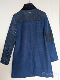 Stile: Cappotto patchwork con un mix di texture, inclusi tessuti bouclé, tweed, velluto/pelliccia sintetica e inserti con paillettes o fili di lurex.