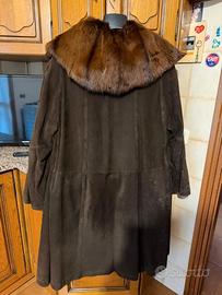 Vendo cappotto lungo vintage da donna. Realizzato in vera pelle scamosciata color testa di moro, con collo in pelliccia a contrasto. Modello svasato con chiusura a bottoni frontali