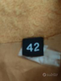 Cappotto giallo ocra di Aspesi di casentino (cioè una particolare lavorazione della lana) in 100% lana, con due tasche davanti e chiusura con i bottoni. Misure: da ascella ad ascella cm 53, lunghezza cm 87, spalle cm 38, manica lunghezza cm 55. Taglia indicata 42. Io lo indosso per fare capire, ho una 44 e una terza di seno e lo indosso in foto sia con una maglietta con maniche lunghe di viscosa sotto sia con un maglioncino di lana e mi sta bene perciò penso che sia una 42 abbondante.
