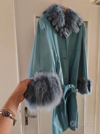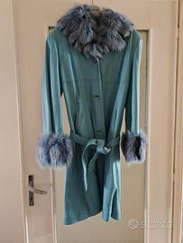 Bellissimo cappotto di pelle, color celeste, con maniche e collo in pelliccia, dal taglio sfiancato, ideale sia per outfit casual sia più eleganti