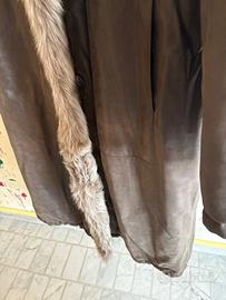 Bellissimo cappotto lungo di pelle esterna con fodera imbottita e profilo di pelliccia di ermellino.