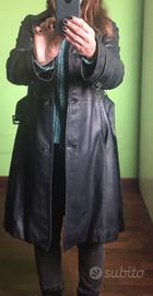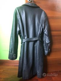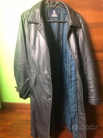 Cappotto/trench Marina Yatching in pelle nero/blu rivestito trapuntato all’interno con cintura.