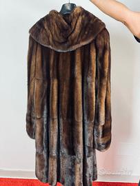 Splendido e lungo cappotto di pelliccia di visone naturale in condizioni eccellenti, pari al nuovo. Questo capo elegante e lussuoso è perfetto per le stagioni più fredde, offrendo calore e stile senza tempo. La pelliccia è di alta qualità, morbida al tatto e con un colore marrone intenso e lucente.