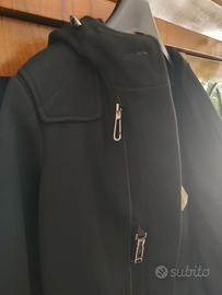 cappotto nero stile montgomery con cappuccio, dentro al cappuccio c'è del morbido pelo