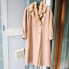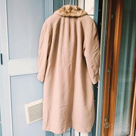 cappotto colore nocciola (dalle foto sembra più chiaro). articolo di sartoria in buone condizioni ma mancano un bottone e un bottoncino. fodera in ottimo stato, due tasche, spalle imbottite. misure: spalle 44 (indicativo), lunghezza 107, torace 58. collo in visone biondo.