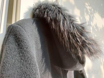 CAPPOTTO DONNA CON CINTA Nero LANA MERINOS CON CAPPUCCIO rifinito in PELLICCIA TAGLIA 46 LUNGHEZZA CM 114 MADE IN ITALY