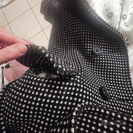 Elegante cappotto nero da donna con una fantasia a leggeri pois bianchi.