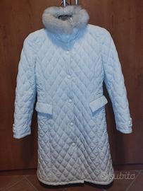 cappotto donna trapuntato con lavorazione a rombi e leggera imbottitura, colore avorio, chiusura con bottoni a clips, taglia large, lunghezza 105 cm, larghezza spalle 45 cm, come nuovo, ottime condizioni e vestibilità.
