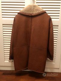 MONTONE DONNA DI MORBIDA VERA PELLE COLOR CUOIO CON INTERNO AVORIO, SHEARLING GARANTITO, COLLO AMPIO E CHIUSURA CON TRE BOTTONI. CALDO E VERSATILE. TAGLIA 44 MODELLO OVERSIZE.