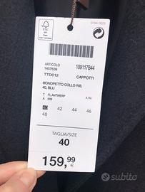 Vendo bellissimo cappotto elegante monopetto donna, nuovo con cartellino, color blu con tasche completamente foderato in tessuto misto lana particolare il colletto che veste una TG. 40/42 pagato 160€ CONBIPEL.