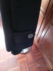 Uno stile senza tempo per questo elegante cappotto nero marca Bridge in pura lana vergine made in Italy dalla linee morbide ed avvolgenti proposto nella taglia 46. L'allacciatura si presenta con 4 bottoni in tinta, di cui 3 nascosti ed uno visibile in prossimità del colletto. I bottoni compaiono anche sulle maniche, come da dettaglio in foto. Completano il tutto due comode tasche aperte oblique.