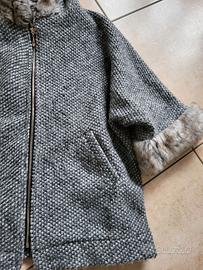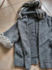Cappotto con maniche 3/4, ecopelo ai polsini ed al cappuccio, zip dorata con brillantino, made in italy