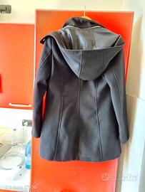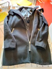 Elegante cappotto donna di colore nero, marca Rinascimento, Taglia M, in poliestere e viscosa completamente foderato in poliestere all' interno, con chiusura full-zip, con 2 tasche laterali con cerniera, con cappuccio staccabile tramite cerniera, con bottoncini sul colletto per attaccare eventualmente un collo in pelliccia sintetica. Usato pochissimo e sempre ben tenuto in armadio.