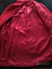 Cappotto rosso donna taglia 50. Misure: circonferenza seno 132 cm, circoferenza fianchi 130cm, lunghezza 86 cm. La fodera di una manica è consumata come da ultima foto. Possibilità di consegna a mano nella zona di Torino e Cuneo e provincia