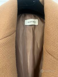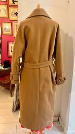 Cappotto Susy Mix colore cammello, modello a vestaglia morbido e lungo senza bottoni, chiusura con cintura, dice taglia xs ma veste fino ad una XL molto bello ma presenta in alcuni punti pelucchi del tessuto dovuti al tempo, come da foto