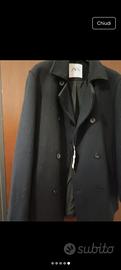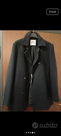 Cappotto doppiopetto Zara corto, blu scuro, con bottoni dal colore a contrasto, due tasche laterali e due interne. È semplice dalle linee dritte. Tg. XL. Altezza 192 cm