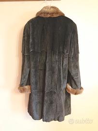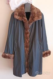 Cappotto double face di pelliccia in Kolinsky rasato tinto in nero da un lato e stoffa impermeabile color grigio scuro dall’altro. Collo, bordatura e polsi in martora. Pari al nuovo, Tg.46. Confezionato da laboratorio artigianale