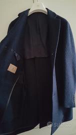 Cappotto da uomo Fradi modello Rain taglia 44 in misto lana colore blu scuro ma non profondo come Nuovo, indossato un paio di volte ma in condizioni impeccabili, come se non fosse mai stato utilizzato, senza difetti, tessuto senza strappi e abrasioni, colore uniforme non sbiadito, mai lavato ma pulito. Acquistato in negozio e indossato forse 2 ore al massimo. Cappottino made in Italy vestibilità Slim dalla linea classica con collo a revers classici e chiusura a tre bottoni in osso, spalle destrutturate, spacco centrale. Veste stretto e conformato sui fianchi e aderisce bene alla schiena grazie alla martingala, due tasche esterne con pattina e due interne chiuse con bottone, taschino al petto, bottoni in osso ai polsi e sulla cintura sulla schiena. Non ha imbottitura interna ma il tessuto a contatto con la pelle trasmette una grande sensazione di calore, la finitura non è pettinata ma grezza però non trattiene i peli e la polvere come i tessuti sintetici. Composizione tessuto 55% cotone e 45% lana vergine, fodera interno maniche e spalle 100% viscosa. Prezzo di listino 439, vendo per inutilizzo. Se interessati sono disponibile ad inviare foto ingrandite o dare dettagli come misure o altro. Posso far provare e consegnare a mano a Conegliano (Tv) oppure spedire. Evitate offerte indecenti. Grazie