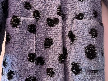 cappotto da ragazza di front street 8. azzurro a pois neri, con due bottini di chiusura; 2 tasche. scritta “c’est la vie” sul retro