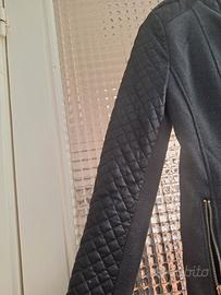 Cappottino in panno grigio scuro con chiusura assimetrica, con dettagli in ecopelle sulle maniche. Presenta due tasche anteriori laterali con zip dorata