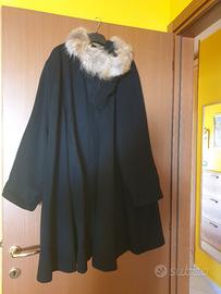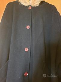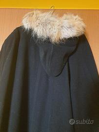 Ampio cappotto a mantella nero. Con cappuccio. 60% Lana e 20%cachemire. Risultano taglia m ma calza grande finoad una xl in quanto molto ampio. Due tasche 4 bottoni. Lavato in lavanderia