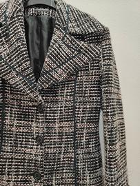 Cappottino in lana dal taglio sagomato, veste sua una S che una XS. Si presenta in tessuto bouclé misto in nero, bianco e appena un rosa chiarissimo. Chiusura con 3 bottoni, spacco classico dietro e presenti due tasche laterali. Oltre al particolare tessuto, sul cappotto cadono due linee sul davanti che vanno ad evidenziarne la sagomatura. Ideale per ogni occasione, sportivo ed elegante contemporaneamente. 50% in lana. Le misure -> distanza spalle 43 cm, distanza cuciture interne ascellari 48 cm, lunghezza maniche 60 cm, lunghezza totale 85 cm. #cappotto #estate #japan #jeans #femme #korean #cappottino #parka #coat #vintagestyle #fashion #chic #vintage #summer #winter #autumn #spring #indie #hipster #aesthetic #alternative #basic #sport #indie #kids #coquette #crochet #man #kawaii #uomo #vendocapi #saldi #sales #outfitoftheday #outfit #set #sconti #arte #art #woman #gold #silver #cashmere #lana