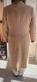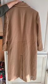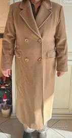 Cappotto color cammello a doppio petto. Colore alla luce naturale in prima foto. Marchio Diana Gallesi, taglia 48 IT. 100% pura lana vergine. Il cappotto non è stato mai indossato al di fuori da casa per provarlo e per le foto, è rimasto però molti anni in armadio e va rinfrescato in lavanderia.