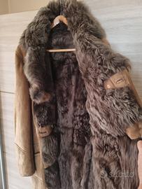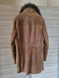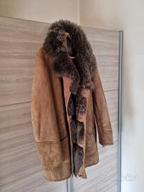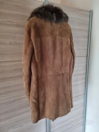• Questo capo è caratterizzato da un esterno in pelle scamosciata (o nappata) e un interno in pelliccia rasata o più lunga, come si vede nel colletto e nei risvolti delle maniche.