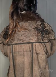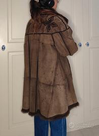 Montone rovesciato original shearling Vintage, originalissimi i ricami con applicazioni in paillettes. Modello scampanato. Rispetto ai tipici montoni rovesciati è molto sottile e leggero, ma anche molto caldo. Il pelo intero è morbidissimo. La pelle ha delle sue macchie che non ne precludono la bellezza, ma che segnalo comunque (vedi foto). Taglia indicata M, vestibilità ampia, credo corrisponda almeno ad L. Bello anche indossato oversize da S o M. Vedi misure in foto. Io in foto sono una S alta m 1,63.