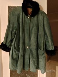 cappotto verde in pelle con collo e bordo maniche in pelliccia nera marca boretti vera pelle