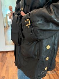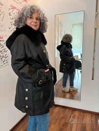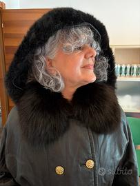 Caldissimo ed elegantissimo cappotto in vera pelle di agnello morbidissima, chiusura doppio petto con cintura e doppia tasca. Impreziosisce il capo l’interno removibile in lapin, Cappuccio in pelle bordato in pelliccia di montone e colletto removibile in volpe. Bottoni e fibbie dorati.