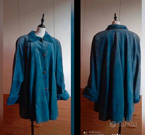 Splendido cappotto in pelle scamosciata bluette, double face, con spaline, taglio ampio a ruota (orlo di quasi 3 metri), chiusura con 4 bottoni, tasche laterali a scomparsa