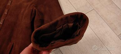 Vendo Cappotto in vera pelle scamosciata taglia 46, con bottoni rivestiti e inserti pitonati, colore marrone scuro. Fodera interna calda, simile al pile.
