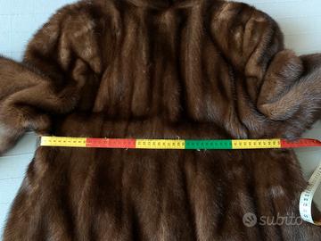 Cappotto di pelliccia di visone marrone scuro con fodera interna coordinata e chiusura a tre ganci.