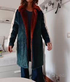 simpatico cappotto in pelliccia sintetica marca oui odile mai indossato. verde a righe blu con strisce bianche sulle maniche e collo color mattone