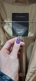 Cappottino donna color oro, in vera piuma d'anatra con cappuccio, 2 grandi tasche davanti, 2 interne laterali con cerniera, taglia S. Lunghezza cappotto 94 cm, manica 61 cm, Busto 43 cm.