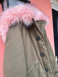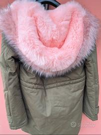 Cappotto colore verde militare, nuovo senza cartellino, in perfette condizioni, mai indossato. Ha un cappuccio di pelo rosa, cerniera e bottoni sul davanti, più una chiusura coulisse in vita.