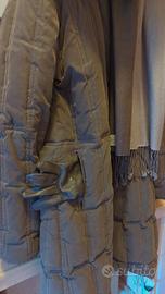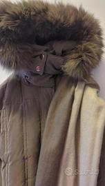 cappotto invernale piumino imbottito pelle d'oca di colore verde scuro, con un cappuccio con bordo di pelliccia (o ecopelliccia).