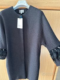 Cappotto kocca nero tg. xs. manica a raglan a 3/4. Piume sul fondo manica che volendo si tolgono, allacciatura coperta sul davanti. Senza collo. Lunghezza circa al ginocchio. Tasche laterali.