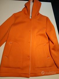 Cappotto leggero- soprabito corto tg 50 XXL nuovo, mai indossato, comprato e riposto nell'armadio. Bellissimo colore arancione. Veste benissimo anche XL. Ha una linea scivolata. Con cappuccio, sfoderato. Viscosa. misue: spalle cm 45, da ascella ad ascella cm 54, lunghezza cm 77. Brand Gaia.