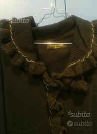 Cappotto lungo nero di maglia con collo e maniche particolari. Marca love sex money, taglia 42