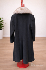 Elegante cappotto lungo color grigio scuro/antracite, modello classico e senza tempo, impreziosito da ampio collo in vera pelliccia di volpe chiara.