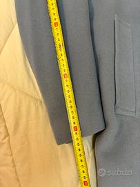 Cappotto anni ‘90 come nuovo, indossato davvero solo un paio di volte. Tessuto splendido e caldo misto lana e Kashmir (86%-14%) dal colore grigio azzurro, lussuosa fodera celeste. Il modello è di quelli molto lunghi, in pieno stile di quegli anni, misura 130 cm da sotto al colletto fino all’orlo, davvero di un’eleganza senza pari.