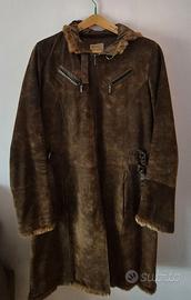 Vendo bellissimo cappotto lungo in vera pelle scamosciata color marrone effetto vintage, con cappuccio e dettagli stile montone. Modello caldo e avvolgente, ideale per inverno e mezze stagioni fredde.