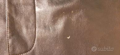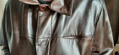 Cappotto da uomo in vera pelle (nappa) marrone, morbido, lungo, elegante e ben costruito da ditta artigiana della zona. Made in Italy autentico, molto ben rifinito, 3 tasche anteriori e un taschino interno con chiusura a cerniera. La taglia riportata in etichetta è solo indicativa, il cappotto ha una maggiore vestibilità. Per questo sono riportate in foto tutte le misure dettagliate. Indossato poco, ma riporta piccole sciupature anteriori e impercettibili sul retro(vedi foto), trascurabili.