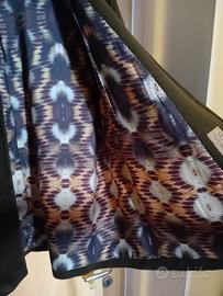 Cappotto Marina Sport, in lana color verde bosco, rifinito con inserti e fodera a fantasia mista (viola, arancio, verde) cuciti a mano; tenuto molto bene; taglia L-XL