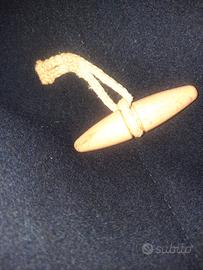 In lana 75% con chiusura con alamari e cappuccio per proteggere da vento e pioggia e tasche frontali per tenere al caldo le mani