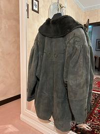 Vendesi caldo montone vintage in vera pelle scamosciata (suede) color grigio antracite con riflessi verde bosco. Interno interamente in morbida pelliccia di lana coordinata.