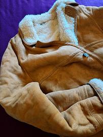 Realizzato in vera pelle scamosciata color cammello all'esterno e foderato internamente con una morbidissima pelliccia di montone color crema, questo cappotto offre un comfort e un isolamento termico eccezionali. Ideale per affrontare l'inverno con eleganza e un tocco di carattere vintage.